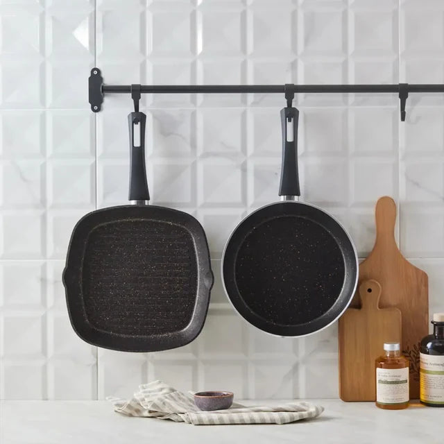 The round frying pan has a diameter of 26 cm and is perfect for making pancakes, omelets, and general frying. Its smooth non – stick surface requires no excess oil and is ideal for delicate cooking. The 28 cm square grill pan has ridged lines for searing and fat drainage, making it perfect for grilling steaks, vegetables, and more.