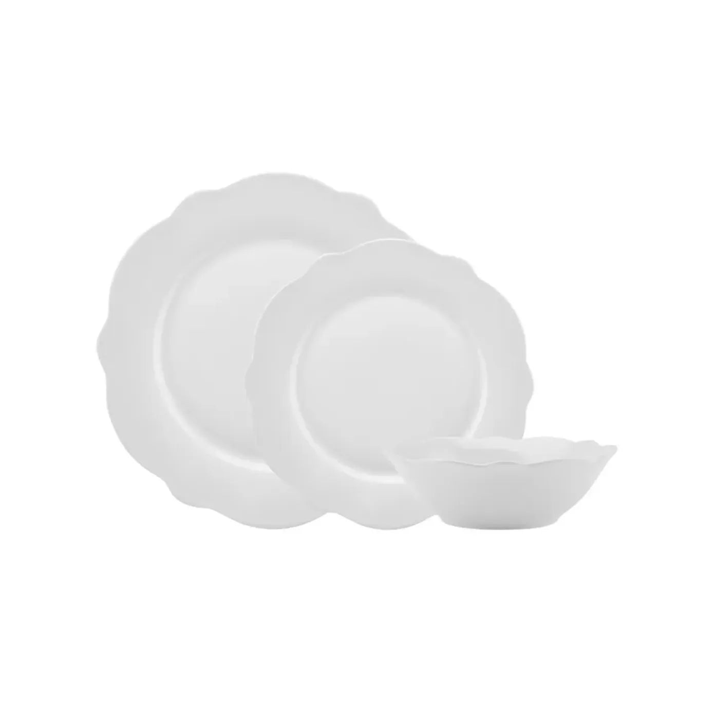 | Design Elements | Delicate scalloped edges on all plates and the bowl |