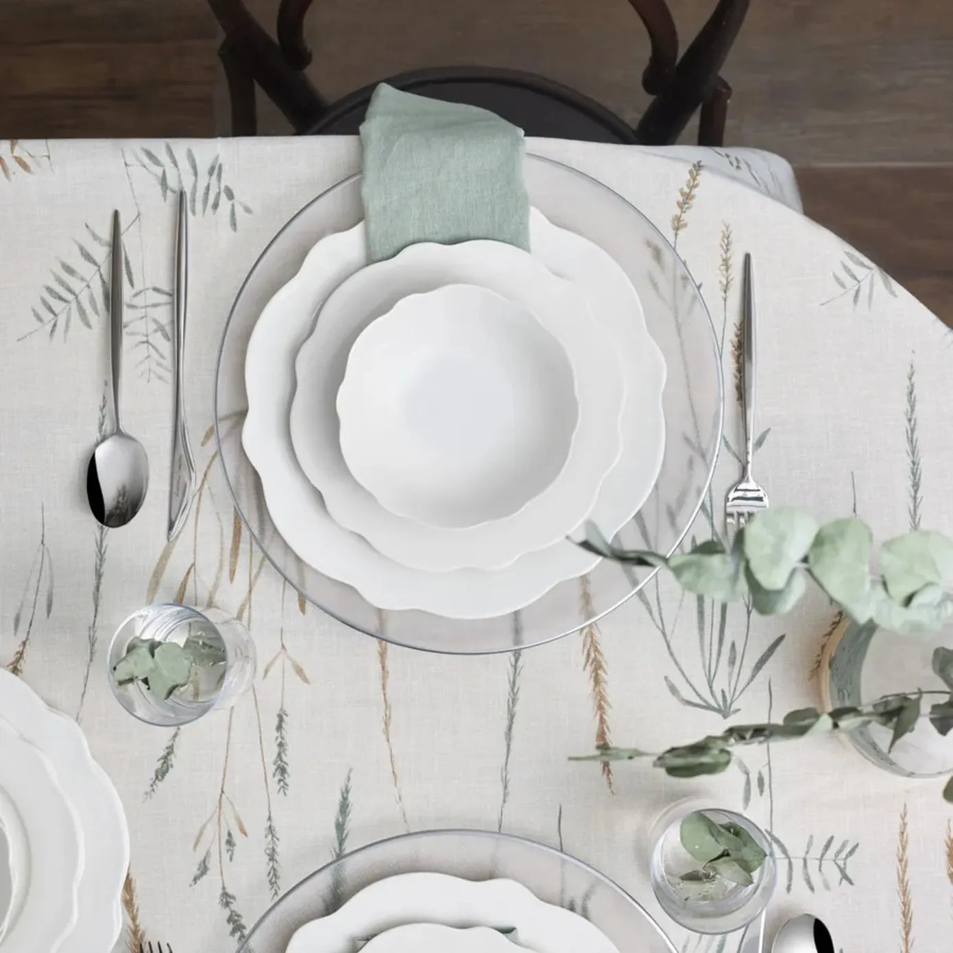 One of the key features of this set is its versatility. It coordinates seamlessly with various table linens and decor, such as the botanical – printed tablecloth and glassware with eucalyptus leaves shown in the product images. Whether you’re hosting a dinner party or having a simple family dinner, this set will complement your table setting beautifully.