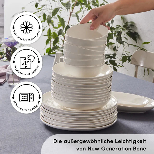 The set is crafted from high – quality bone china, as indicated by the “New Generation Bone” label and the “Bleifrei” (lead – free) badge, ensuring safety for food contact. The bone china material gives it a smooth, glossy or matte finish, and a lightweight yet durable construction.