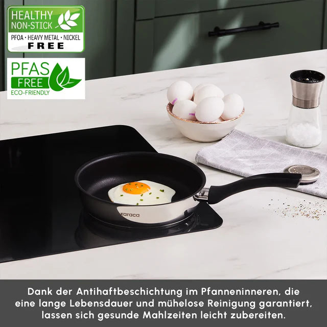 | Visual Elements | Green badges for “HEALTHY NON – STICK” and “PFAS FREE”; White circular badges with text “Fleckenbeständig”, “Spülmaschinentest”, “Leicht zu reinigen”; “HERGESTELLT IN DER TÜRKEI” badge; “INDUCTIONS BASIS” silver badge |