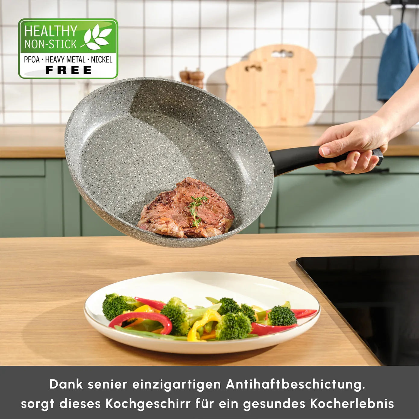 The pans feature a granite – like non – stick coating, specifically the ILAG NON STICK SWISS TECHNOLOGY GRANITEC, labeled as “ANTIHAFTBESCHICHTUNG”. This non – stick coating is not only effective in preventing food from sticking but is also PFOA, heavy metal, and nickel – free, ensuring healthy and low – oil cooking.