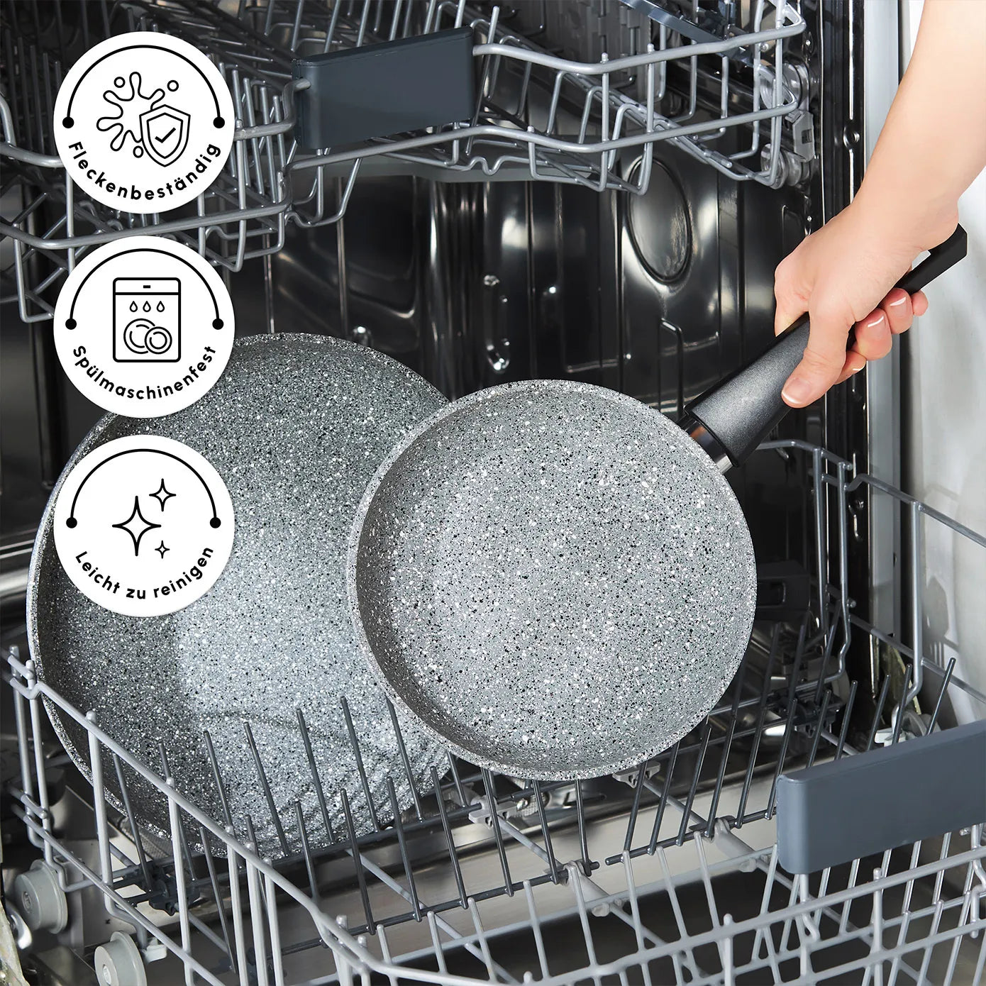 The pans are not only durable with a 3.4 mm wall thickness, ensuring a long lifespan and an elegant appearance, but they are also easy to clean. They are labeled as “leicht zu reinigen” and are dishwasher – safe.