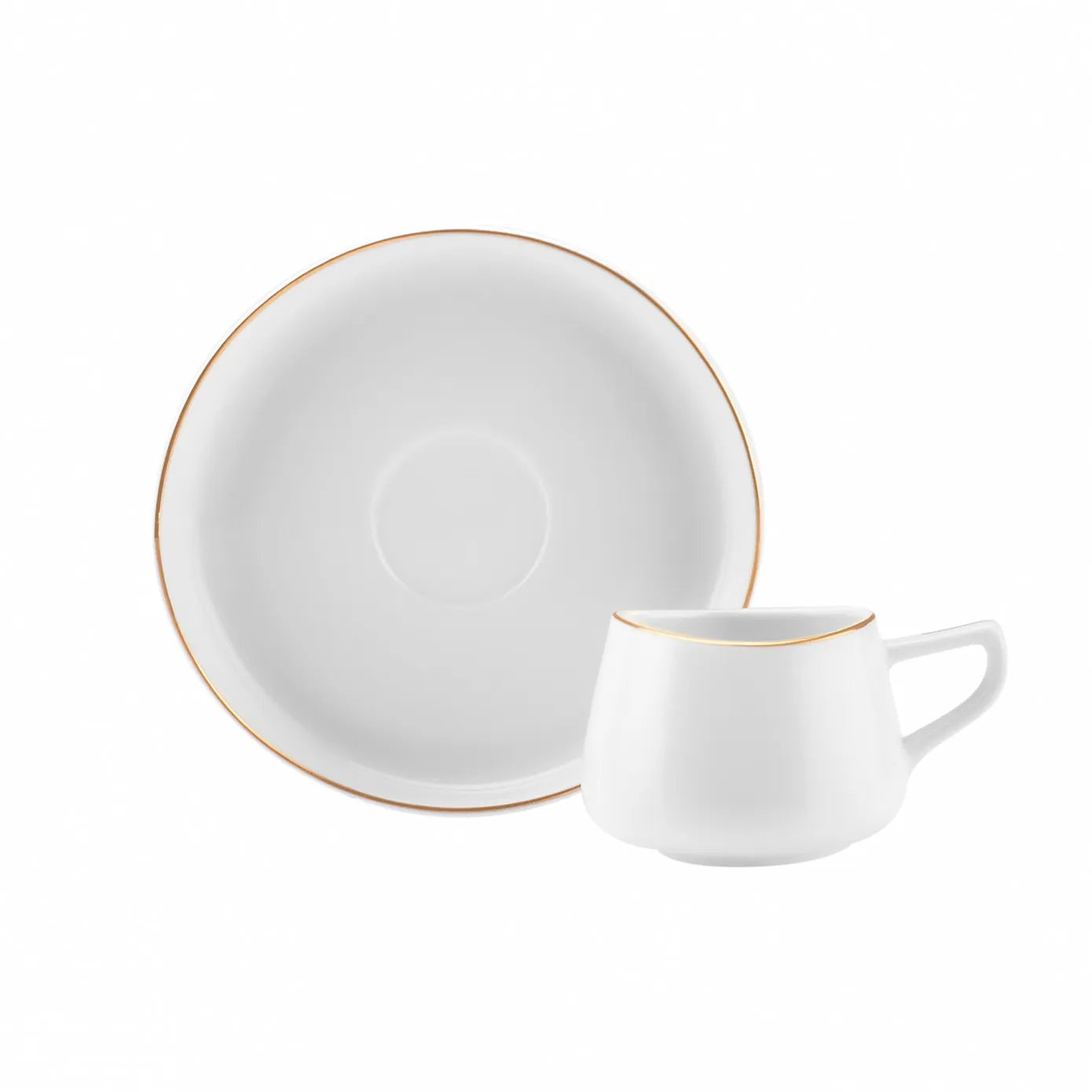 | Design | Minimalist, smooth curves; cup with tapered shape, simple handle; round, flat saucers with gold outline |