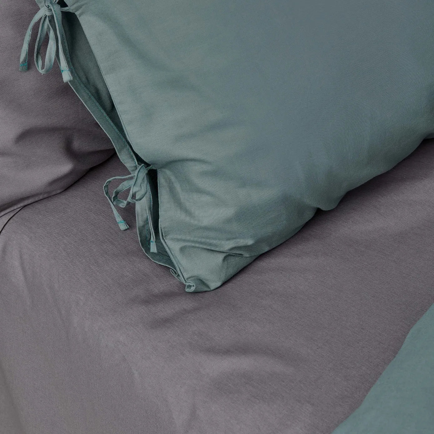 The pillowcases come with practical and stylish teal fabric ties. These ties not only secure the pillows inside the pillowcases, preventing them from slipping and keeping your bed looking neat, but also add a decorative touch. The gray pillowcase features a clean, finished edge with a matching teal trim, and there are subtle teal stitching details on the seams and ties, adding to the overall modern and minimalist design.