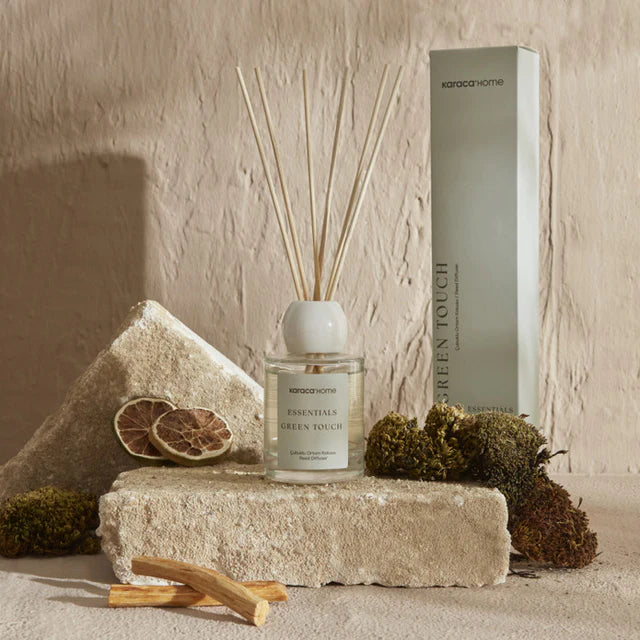 The diffuser comes in a clear glass bottle, which is not only scratch – resistant with a seamless and smooth finish but also allows you to see the scented liquid inside. The white ceramic or porcelain cap is small, with a diameter of 1 – 1.5 inches. It has a smooth, rounded shape and a subtle matte finish, adding a refined touch to the overall minimalist look. The black text on the white label clearly displays the “ESSENTIALS GREEN TOUCH” and “KARACA HOME” branding for easy readability.