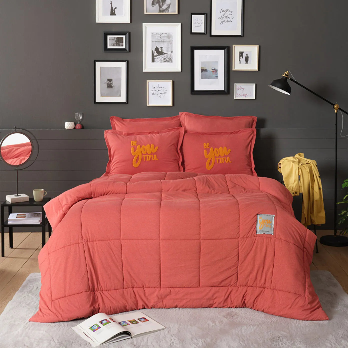 The color palette of this set is truly eye – catching. It has a warm, reddish – orange primary color reminiscent of terracotta or brick red, paired with a bright yellow accent color. The decorative text “BE YOU TIFUL” is a standout feature. Styled in a playful, cursive font for “you” and smaller, bold lettering for “BE” and “TIFUL,” it is applied via an embroidered or tufted technique, creating a raised, tactile design on the pillowcases and a small patch on the comforter. A matching gray tag on the comforter repeats the “BE YOU TIFUL” design in yellow, adding a branded and decorative touch.