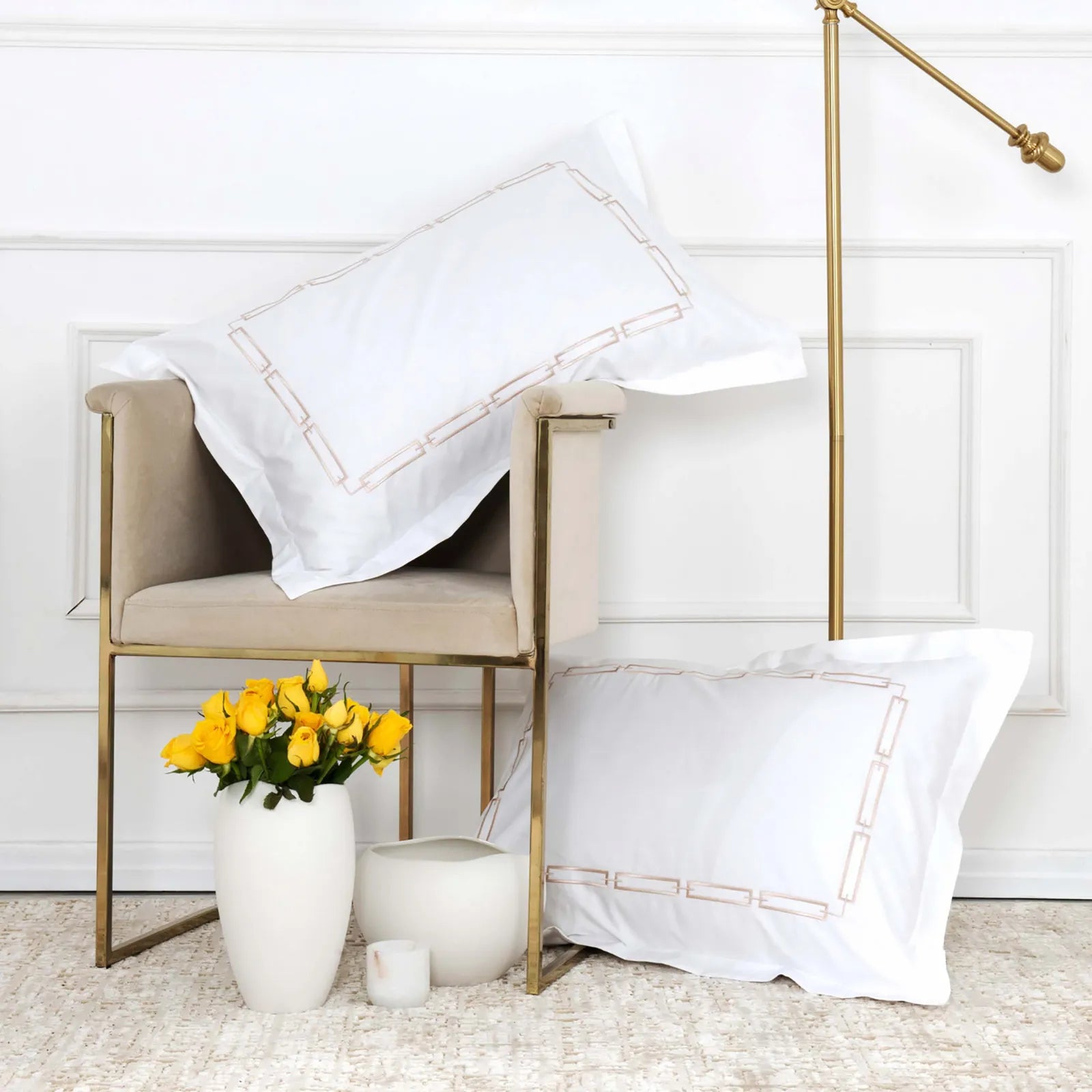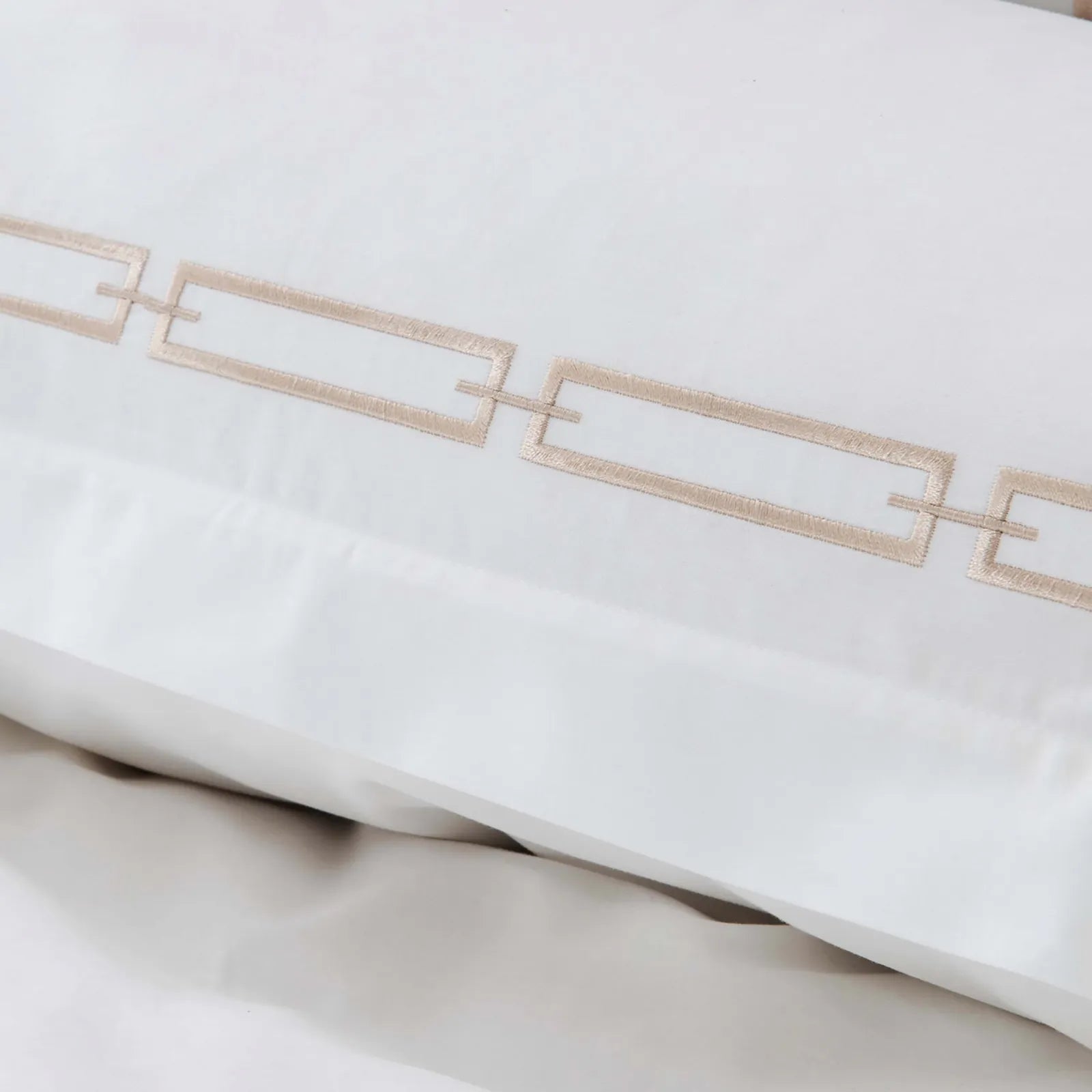 The color scheme is a harmonious combination of a crisp white base fabric and a light gold/beige metallic thread for the embroidery. The geometric, chain – like pattern with interlocking rectangular shapes is consistently repeated across the duvet cover and pillowcases, creating a cohesive and refined look.