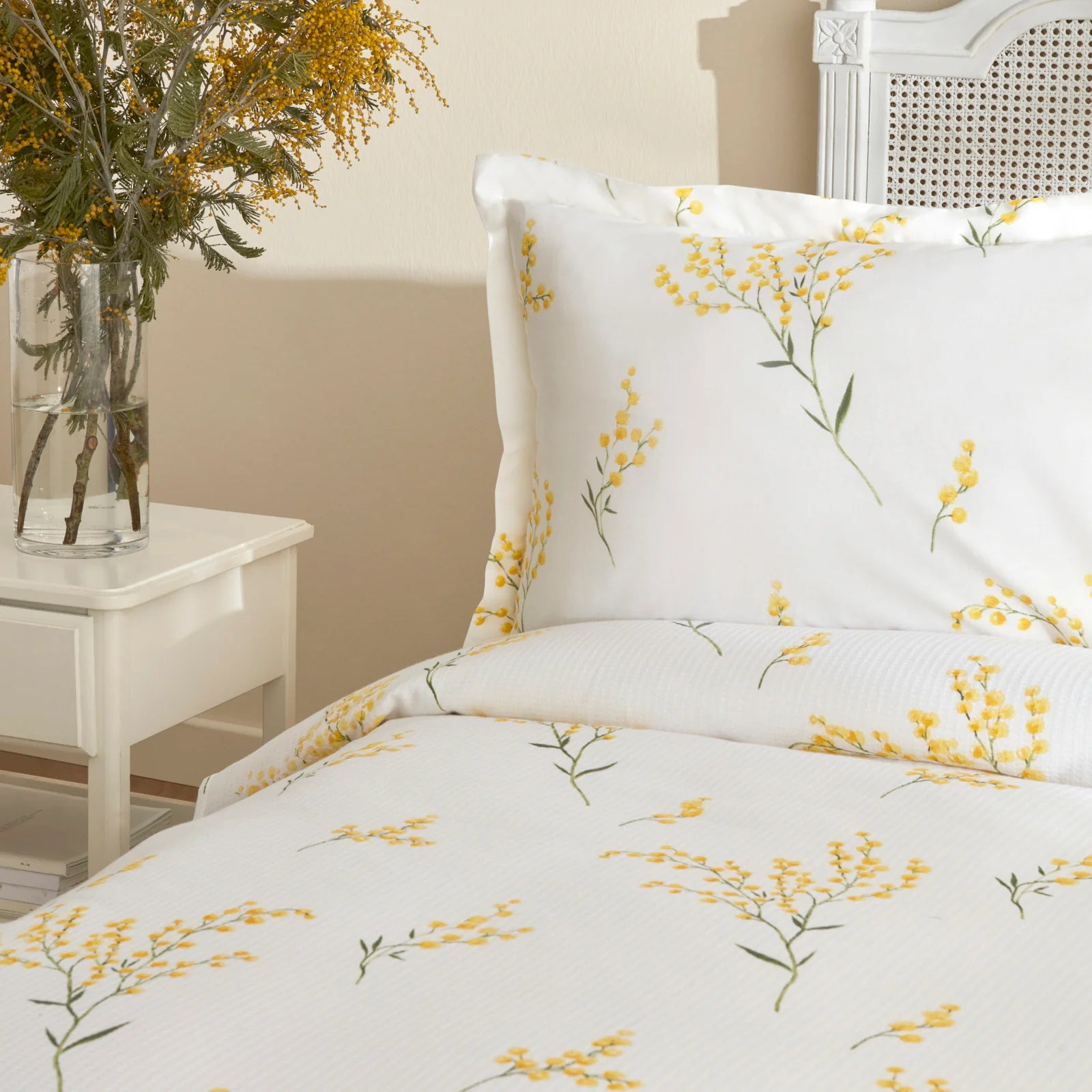 The set features a cohesive yellow floral pattern on a white base fabric, creating a fresh and airy look. The delicate, scattered botanical design resembles mimosa or wattle flowers, with bright yellow blooms on thin green stems and subtle green accents on the fabric edges. The pattern is repeated evenly across the duvet cover and pillowcases, ensuring a unified and harmonious appearance.