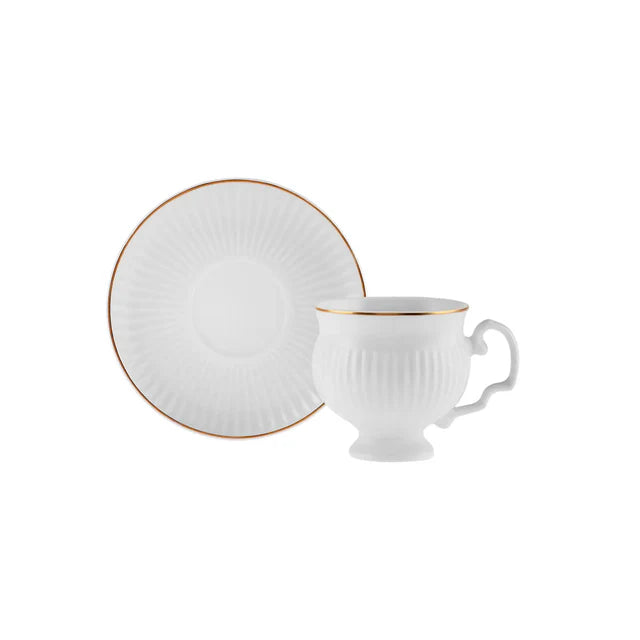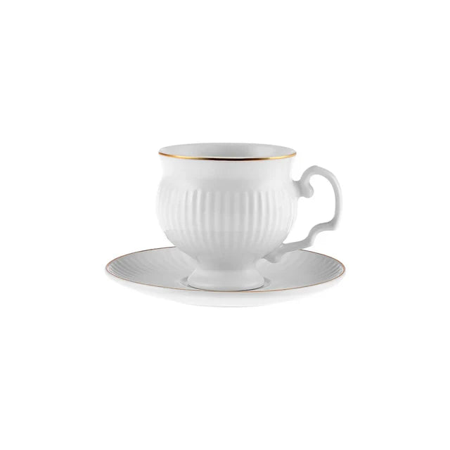 | Features | Ribbed fluting, gold trim, 6 cups + 6 saucers, curved handles, seamless construction |