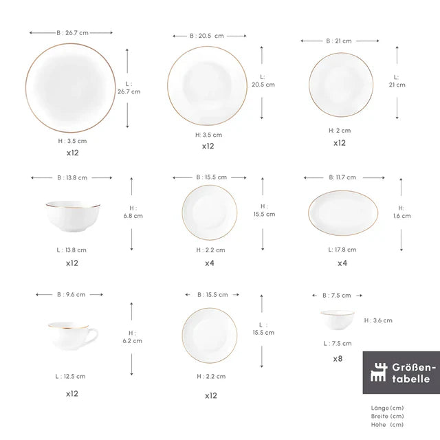 The set includes a variety of pieces to meet diverse dining needs. There are large plates with a diameter of approximately 26.7 cm and a height of 3.5 cm (12 pieces), medium plates with a diameter of 20.5 cm and a height of 3.5 cm (12 pieces), and another set of small plates with a diameter of 21 cm and a height of 2 cm (12 pieces). The bowls have a diameter of about 13.8 cm and a height of 6.8 cm (12 pieces), while the cups measure 9.6 cm (base) x 12.5 cm (length) and 6.2 cm in height (12 pieces). Additionally, there are small saucers with a diameter of 15.5 cm and a height of 2.2 cm (4 pieces) and an oval dish with a length of 17.8 cm and a height of 16 cm (4 pieces).