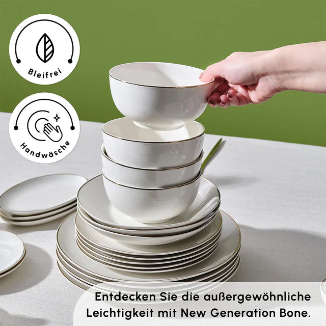 Made from fine ceramic or bone china, specifically the “New Generation Bone” material, this set is lead – free (“Bleifrei”), ensuring safety for food contact. The smooth, white, glossy finish is characteristic of high – quality bone china, and the gold trim around the edges of all pieces adds a sophisticated and elegant look, following a modern, sleek, and minimalist design aesthetic.