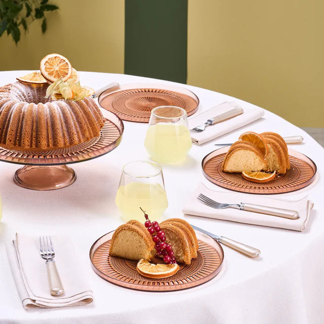 The warm amber/rose – gold color of the glassware is both inviting and sophisticated. The plates feature a radial embossed pattern with concentric circles or dots radiating from the center, creating a decorative and textured surface. The cake stand mirrors this pattern on its top plate and has a tall, slender pedestal base that is also embossed. Clear yellow drink glasses with a geometric cut provide a sharp contrast, making the amber plates stand out.