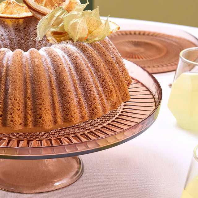 The primary material of this set is high-quality colored glass, likely with a durable, transparent amber/rose – gold tint. The glass is smooth, thick, and free of visible bubbles or imperfections, suggesting a high – end construction that may be heat – resistant, similar to borosilicate glass. The cake stand and plates are made from the same material, ensuring a cohesive look.