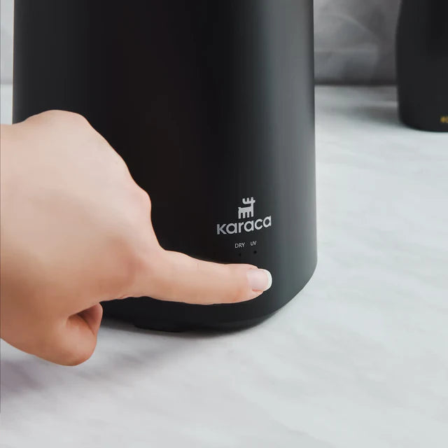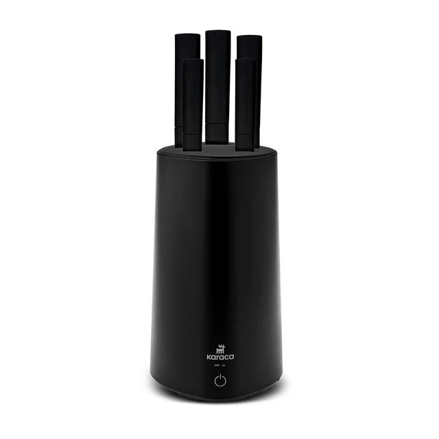 Introducing the Karaca Meister Sterilisator Messerblock in a sleek black finish, a modern and hygienic kitchen solution that combines storage, UV sanitization, and drying functions. This innovative product is designed to meet the needs of home cooks who value organization and hygiene in their culinary space.