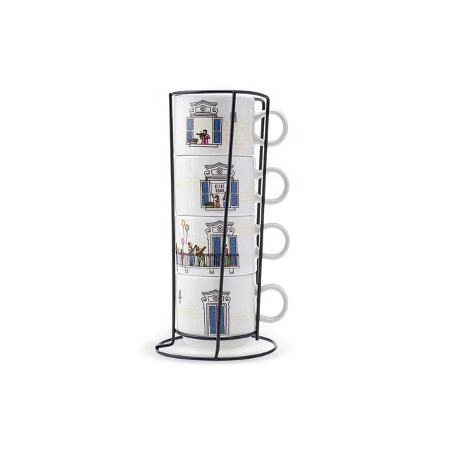 Introducing the Karaca Melody 4 teiliges Tassen-Set mit Ständer, a delightful and functional addition to your kitchen! This set consists of four stackable ceramic mugs, perfect for serving hot beverages like coffee and tea, and comes with a sleek black metal wire rack for space-saving storage.