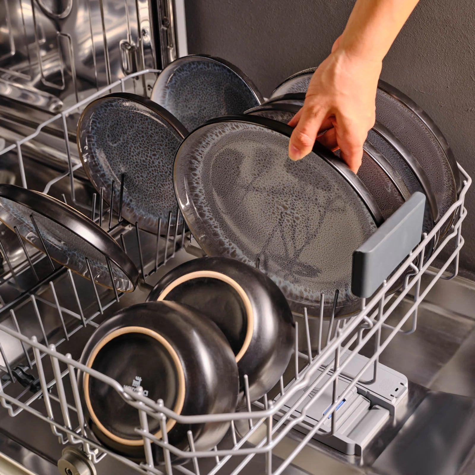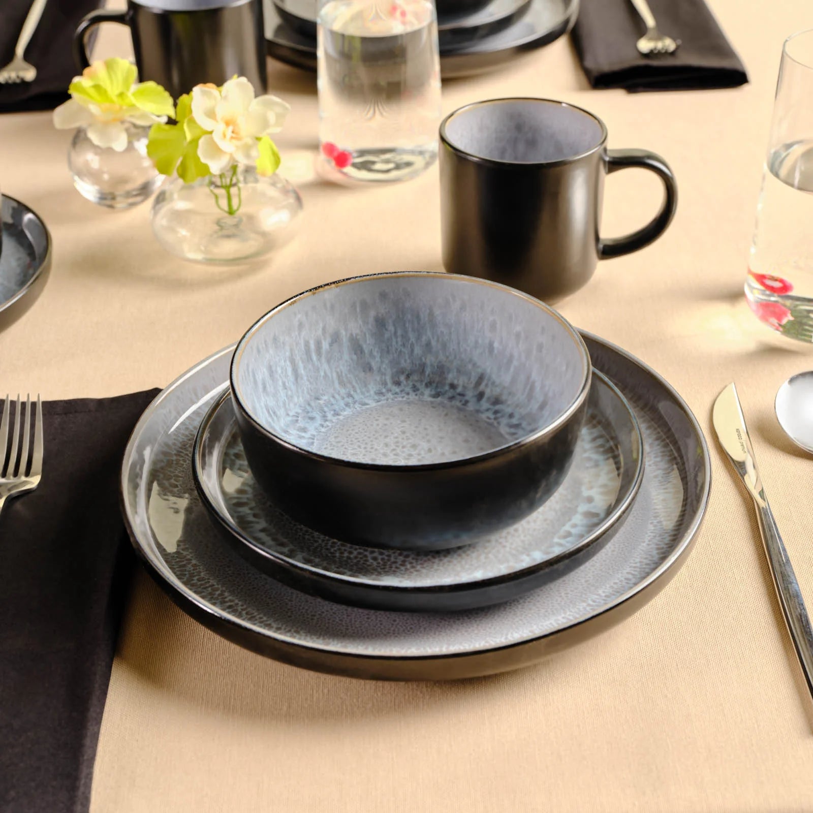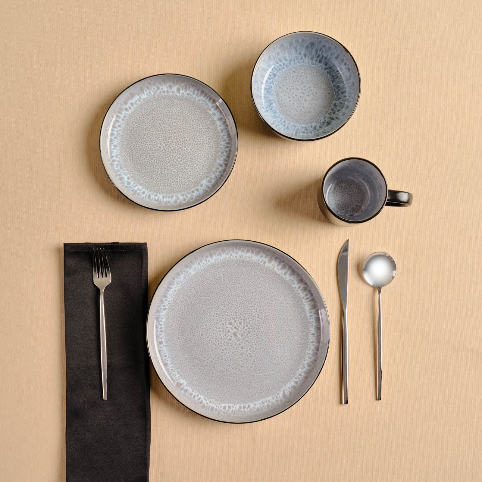 The exterior of the plates, bowls, and mugs is a solid black with a smooth, matte or semi – gloss finish. Inside, there’s a speckled, textured pattern in shades of gray and blue, created using a “bubble” or “spotted” glaze technique, adding a unique visual appeal. The uniform design across all pieces gives a modern, minimalist aesthetic.