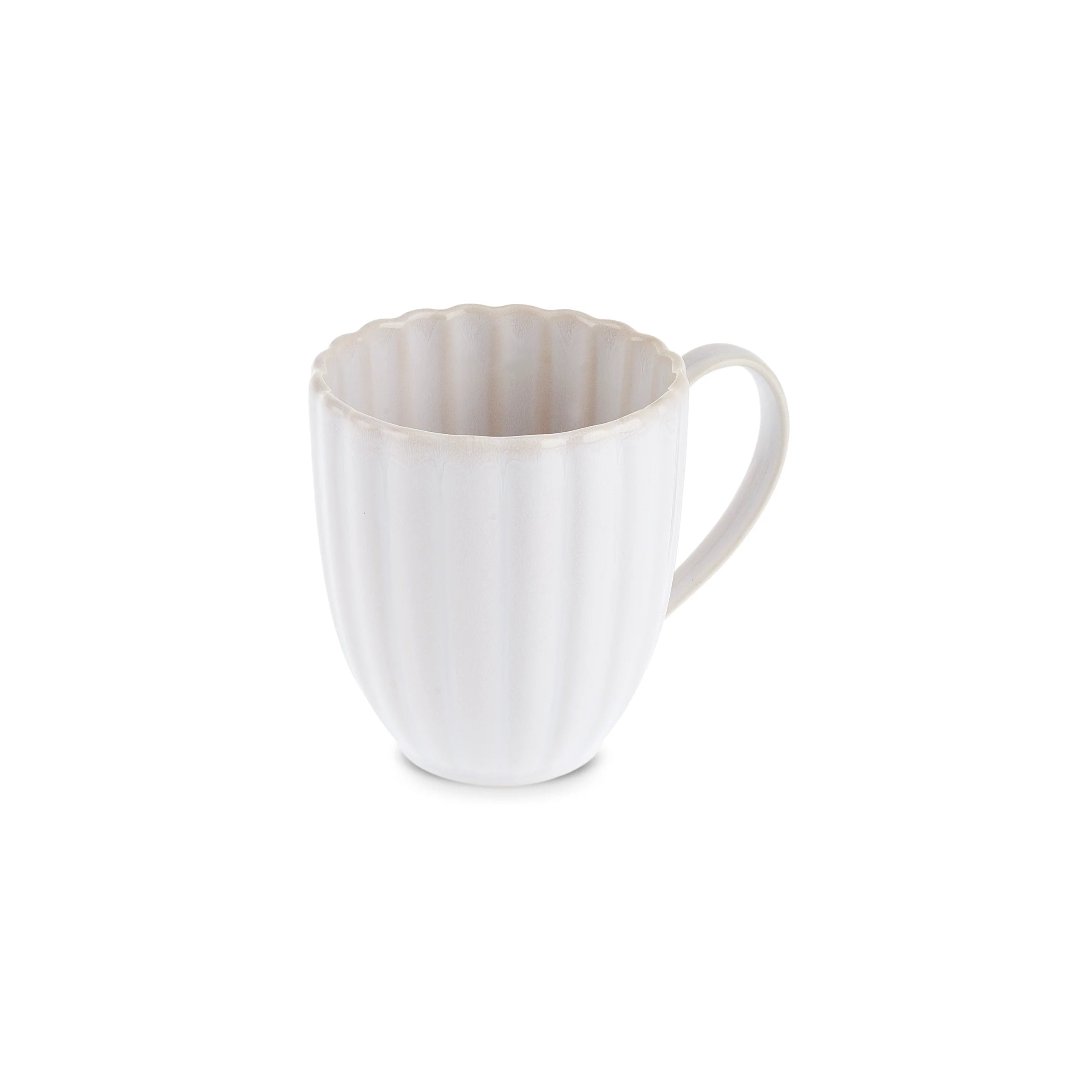 The mug features a tall, fluted body with a handle, and its design aligns with formal tea serviceware. The vertical fluted (ribbed) texture on the exterior creates a scalloped, decorative pattern, while the scalloped rim adds a touch of elegance. The handle is a simple, curved loop that matches the fluted aesthetic.