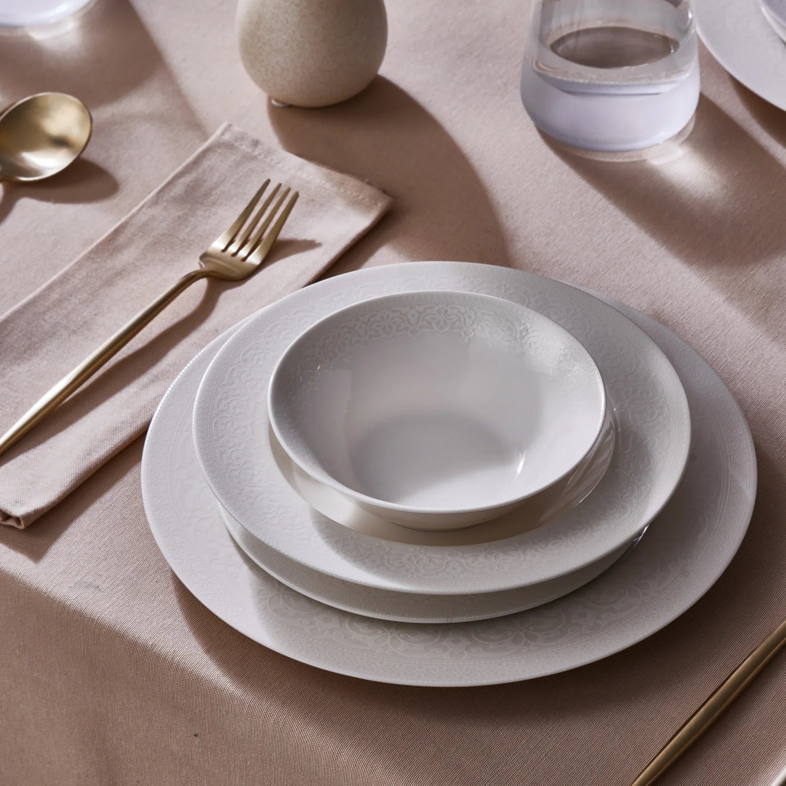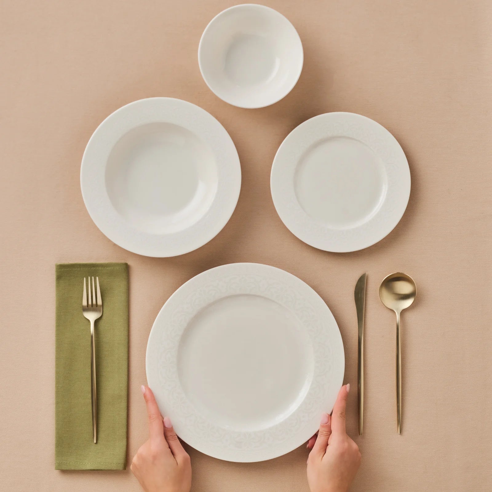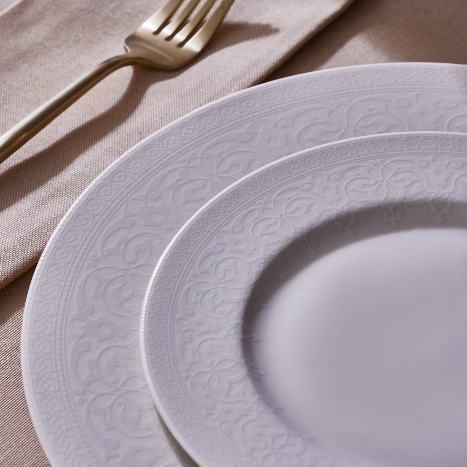 The set features an intricate, repetitive embossed pattern, likely floral or geometric, around the edges and inner rims of the plates and bowls. This subtle yet refined design adds a delicate touch without overwhelming the overall aesthetic. The uniform pattern across all pieces ensures a cohesive and elegant look, making it suitable for both formal occasions and everyday meals.