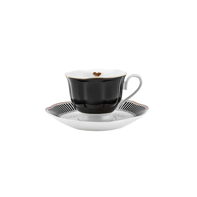 The cups feature a black exterior that beautifully contrasts with the white interior. A small gold heart adorns the white interior rim, adding a touch of romance. The white handle is not only ergonomic for a comfortable grip but also enhances the overall visual appeal. The cup stands on a slightly elevated white base, ensuring stability on the saucer.