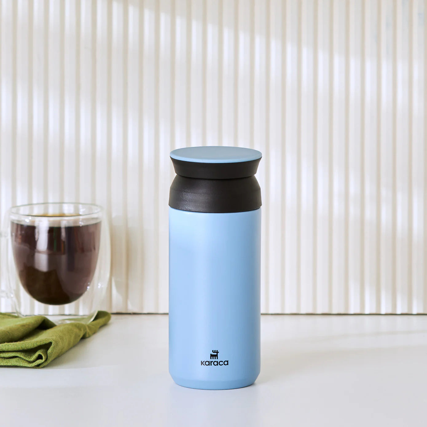 With its double – walled stainless steel construction, this thermos can retain heat or cold for extended periods. It’s ideal for all – day use, whether you’re sipping on a hot coffee in the morning or a cold smoothie in the afternoon. The cylindrical shape with a contoured, ergonomic lid gives it a modern and sleek aesthetic, and the “Karaca” logo printed in black text with a small icon above adds a touch of branding.