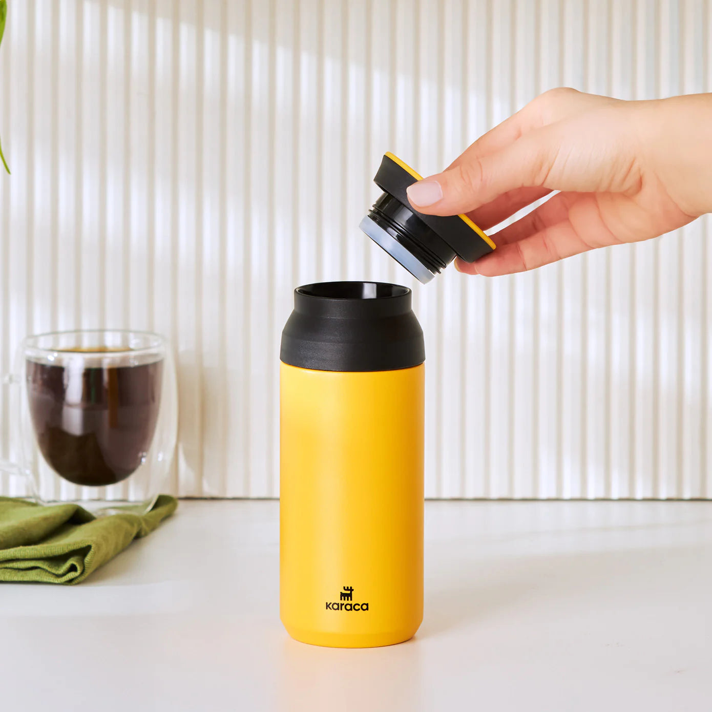 The color scheme of this tumbler is eye – catching, with a dominant bright yellow matte finish and black accents. The minimalist design features clean lines and a smooth, rounded silhouette. The brand name “karaca” is printed in black text below the black band, adding a touch of style without being too cluttered. The lid has a dual – tone design (yellow top, black base) and a wide, textured black ring for easy gripping and insulation.