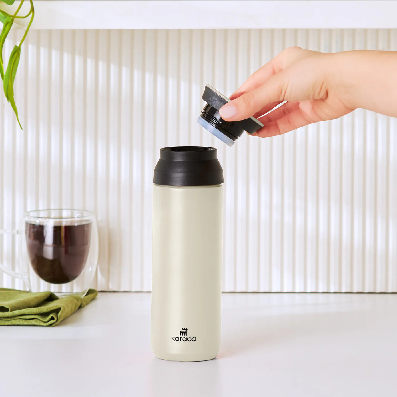 The main body of the tumbler is made of high – quality 304 stainless steel, which provides exceptional durability and thermal insulation. The matte finish not only gives it a scratch – resistant surface but is also food – safe. The lid is made of food – grade plastic with a silicone seal, ensuring a leak – proof design. The black accent band around the lid area and the contrasting black top add a modern and minimalist touch to the light cream/ivory matte finish of the main body. The embossed “karaca” logo on the front enhances its premium look.