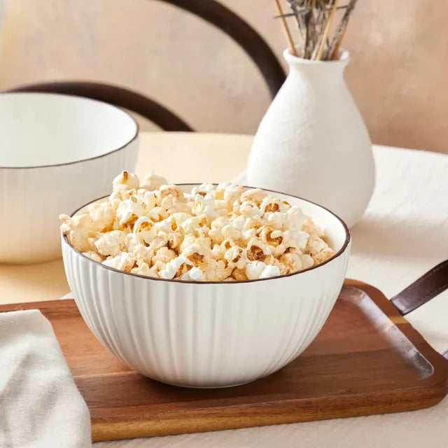 Crafted from high – quality ceramic/porcelain, these bowls feature a smooth, white glazed finish. The primary color is a pristine white, while a dark brown rim around the inner edge adds a touch of contrast and sophistication. The exterior of the bowls showcases a vertical ribbed (grooved) design, which not only provides a unique decorative texture but also offers a better grip when handling the bowls.