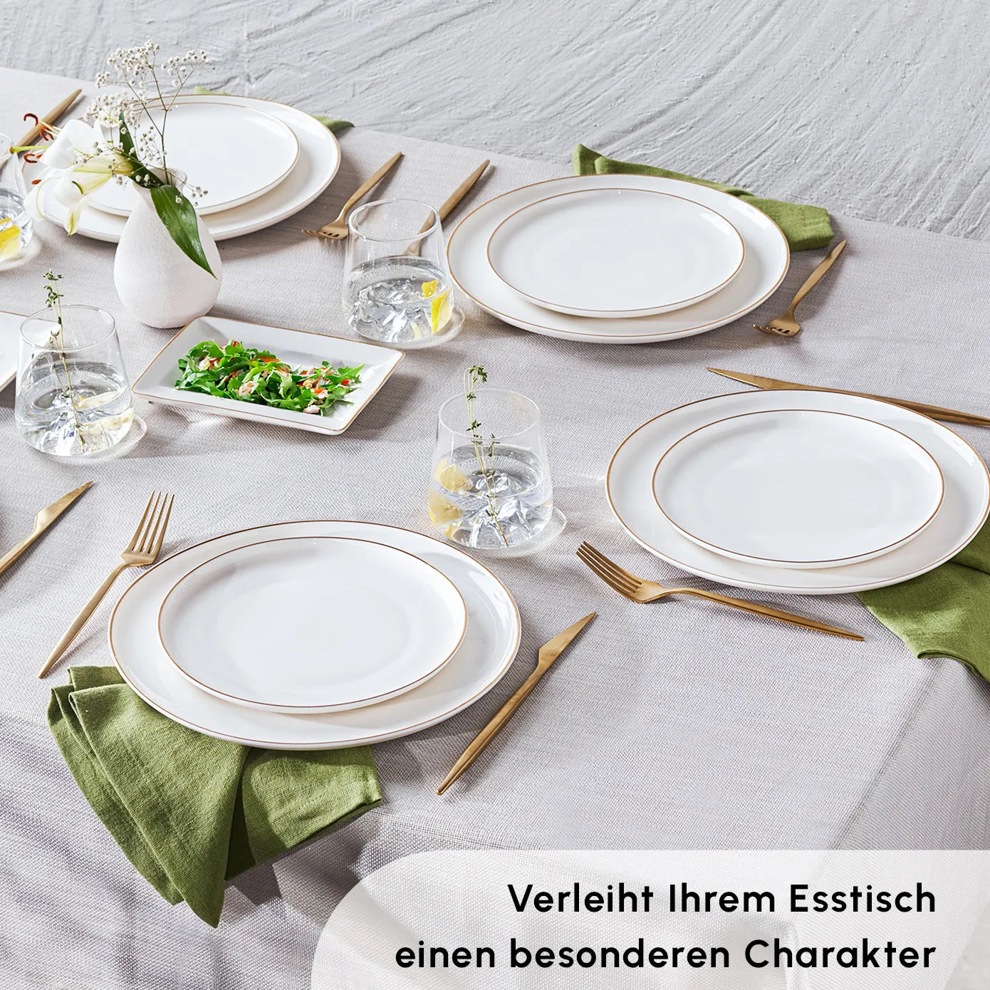 The color scheme of this set is both elegant and versatile. The plates have a glossy white primary color, which is complemented by a delicate gold rim on all plates. This minimalist design with clean lines allows it to fit seamlessly into both formal and casual dining settings, whether you’re hosting a grand dinner party or enjoying an everyday meal.