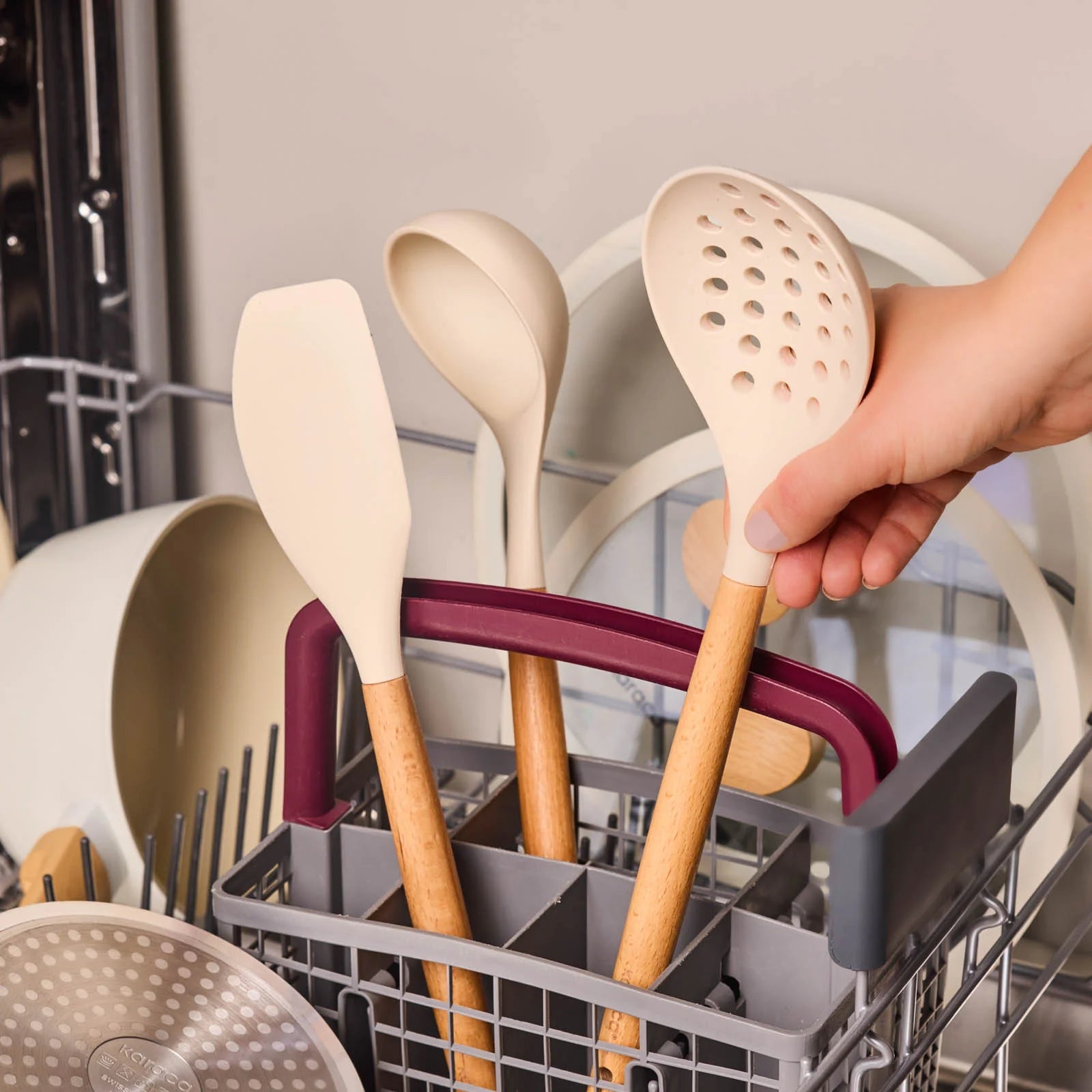| Material (Utensils) | Heat – resistant body (silicone or food – grade plastic in white/cream), wooden handles |