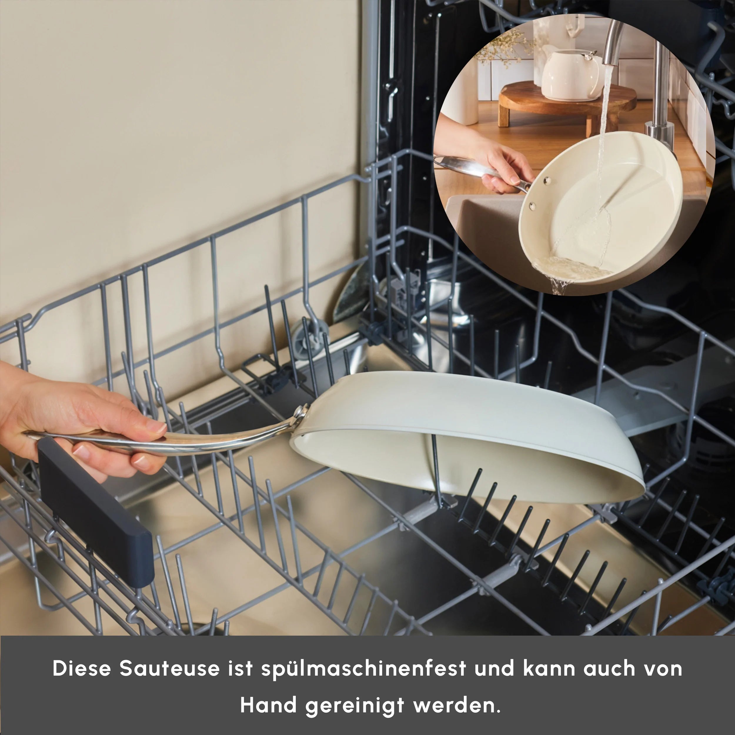 The base of the pan is likely made of a metal like aluminum or stainless steel, which ensures excellent heat conductivity and durability, providing even heat distribution during cooking. The non – stick coating is ceramic – based, as indicated by the German text “GESUNDHEITLICH UNBEDENKLICHE KERAMIK – ANTIHABT – BESCHICHTUNG”. It’s completely safe, with no toxic substances, no PFAS (perfluorinated compounds), and it even allows you to cook “Kein Öl nötig” (no oil needed), making it a healthy choice for your kitchen.