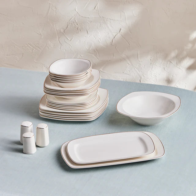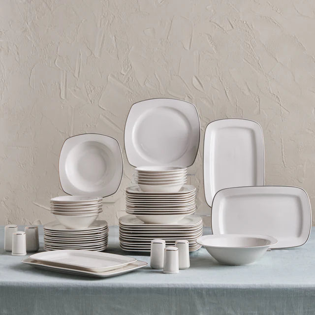 The set offers a wide variety of pieces to meet all your dining needs. It includes square and rounded – square plates in small (≈6–7 inches), medium (≈10–12 inches), and larger square (≈11–12 inches) sizes, perfect for appetizers, main courses, and side dishes. The bowls come in small (≈5 inches diameter) for side dishes and larger (≈6 inches depth) for soups or entrees. There are also rectangular platters (≈12–14 inches length) for serving main courses or sides, and small shakers (≈2–3 inches height) for salt and pepper.