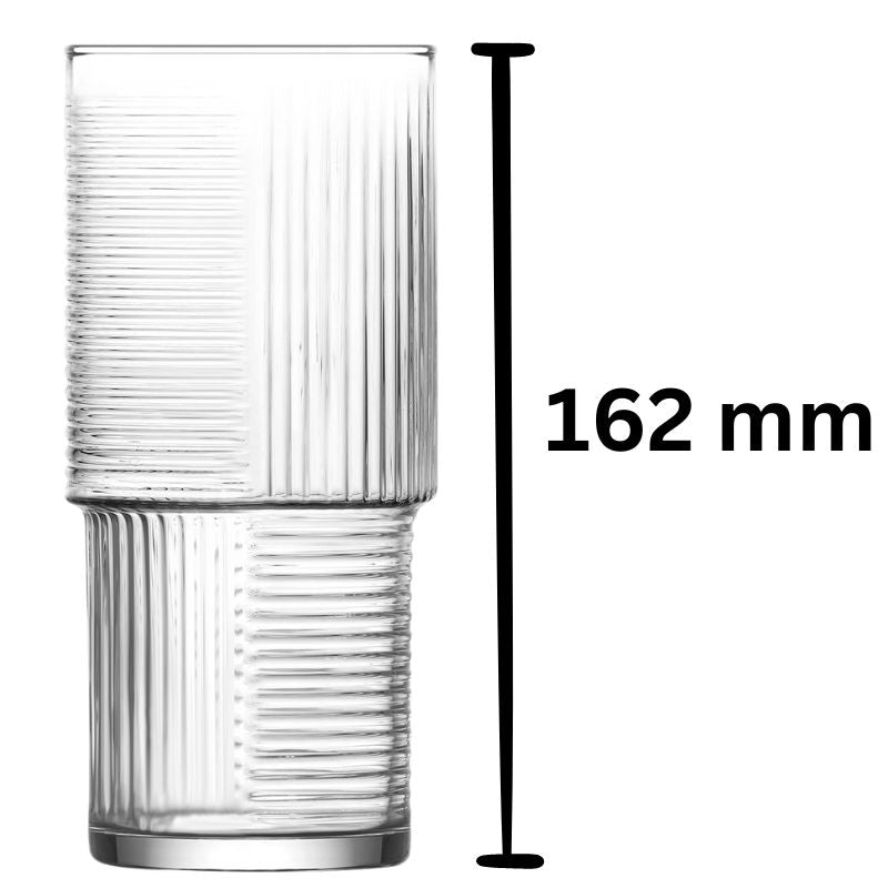 Each glass stands at a height of 162 mm (≈6.4 inches), with a wide and stable base. The thick, even base ensures stability and reduces the risk of tipping, making it suitable for various beverages like water, juice, cocktails, and other highball drinks.