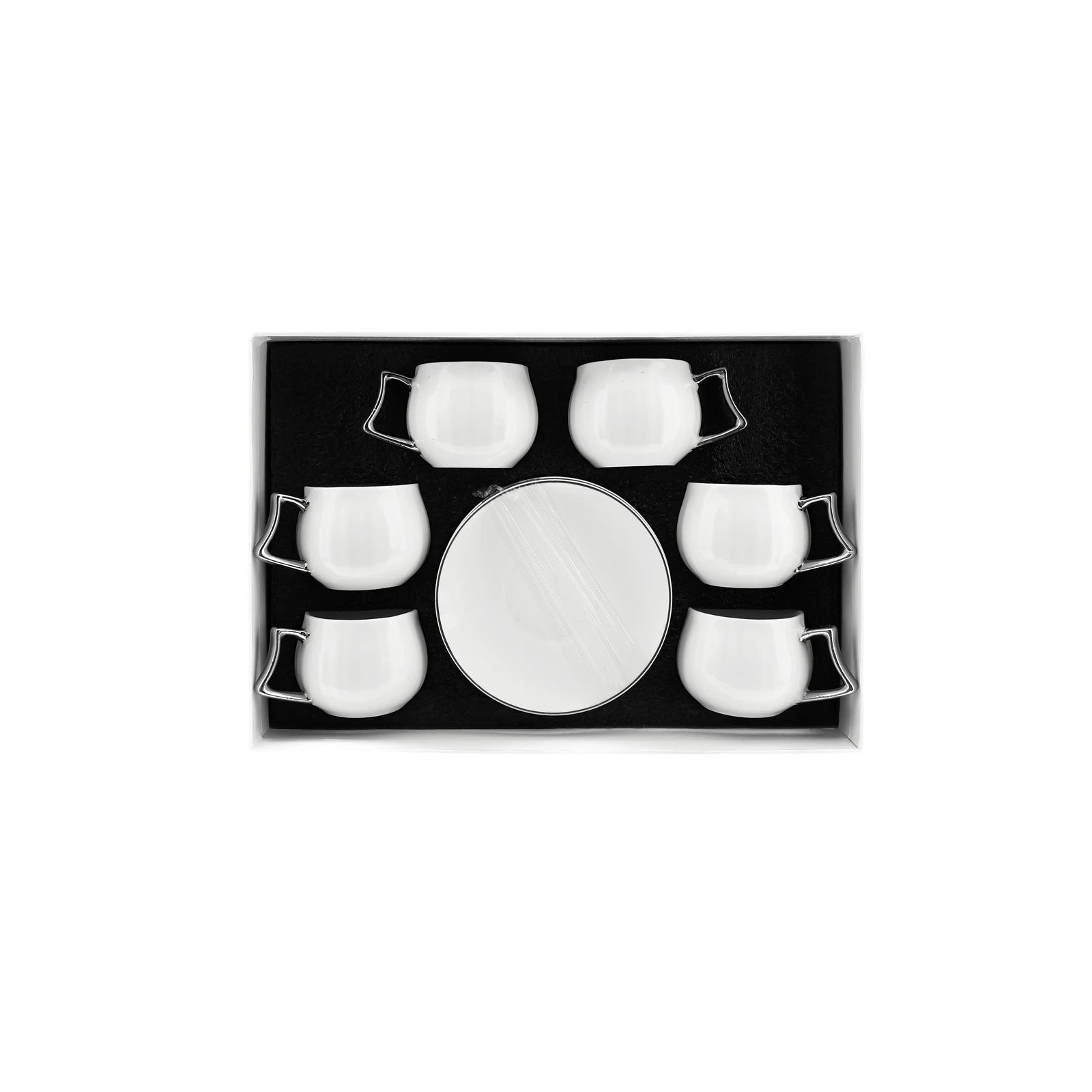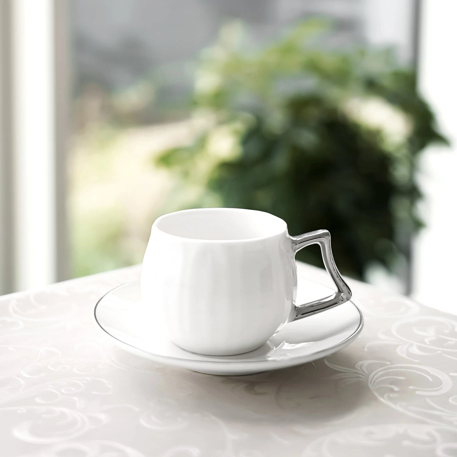 The design of this set is both stylish and practical. The cups have a rounded, slightly fluted body with angular, sleek silver handles that provide an ergonomic grip. The saucers are plain white with a silver rim, creating a polished contrast. The overall look is minimalist and upscale, making it suitable for both modern and classic table decor.
