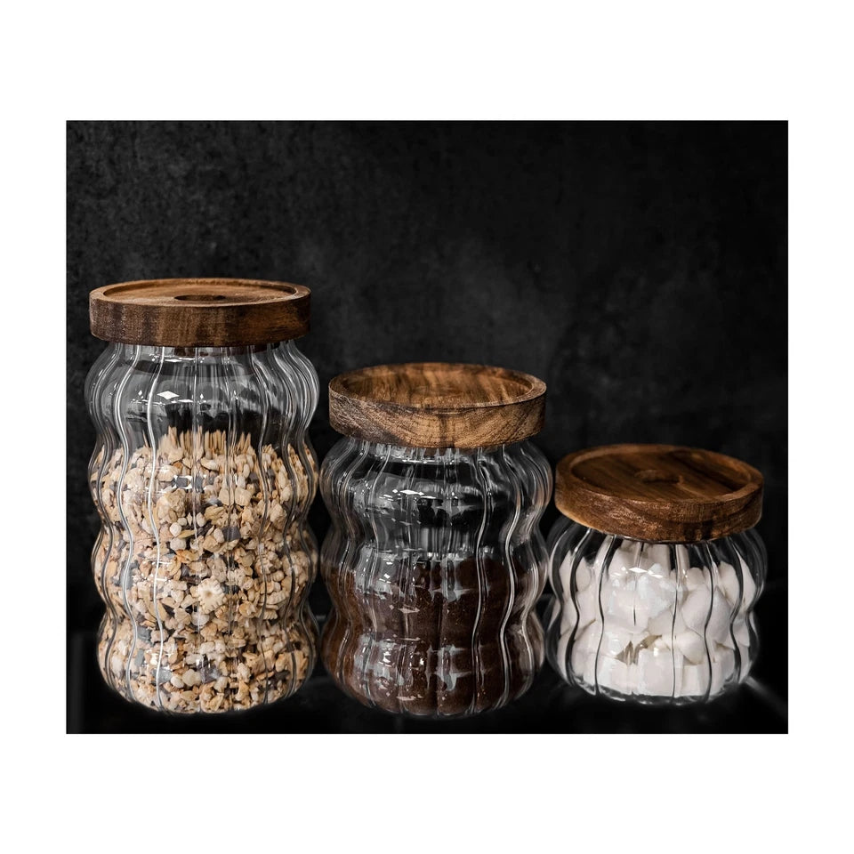 | Features | Clear glass for content visibility; wooden lids for freshness preservation; holes in lids for labeling or hanging; textured jars for grip and visual interest |